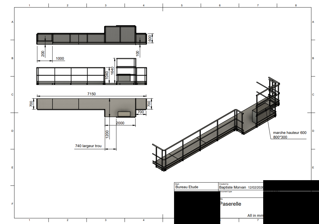 Conception d'une passerelle industrielle avec mécanisme de réglage en hauteur, modélisée en 3D et préparée pour fabrication en atelier de chaudronnerie.